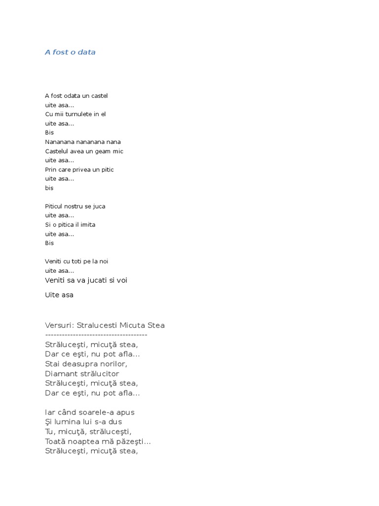 A Fost Odata Un Castel Cantecel Cu Versuri Copilaria Net