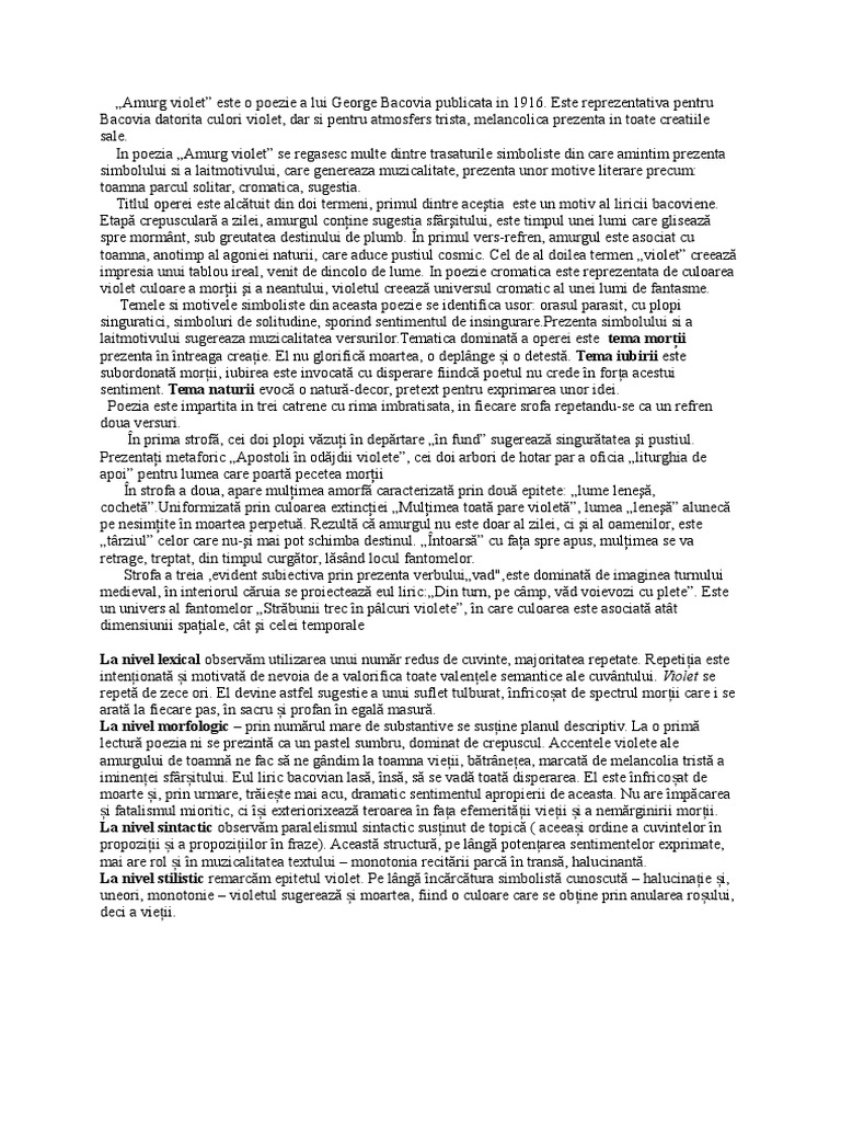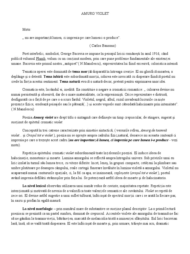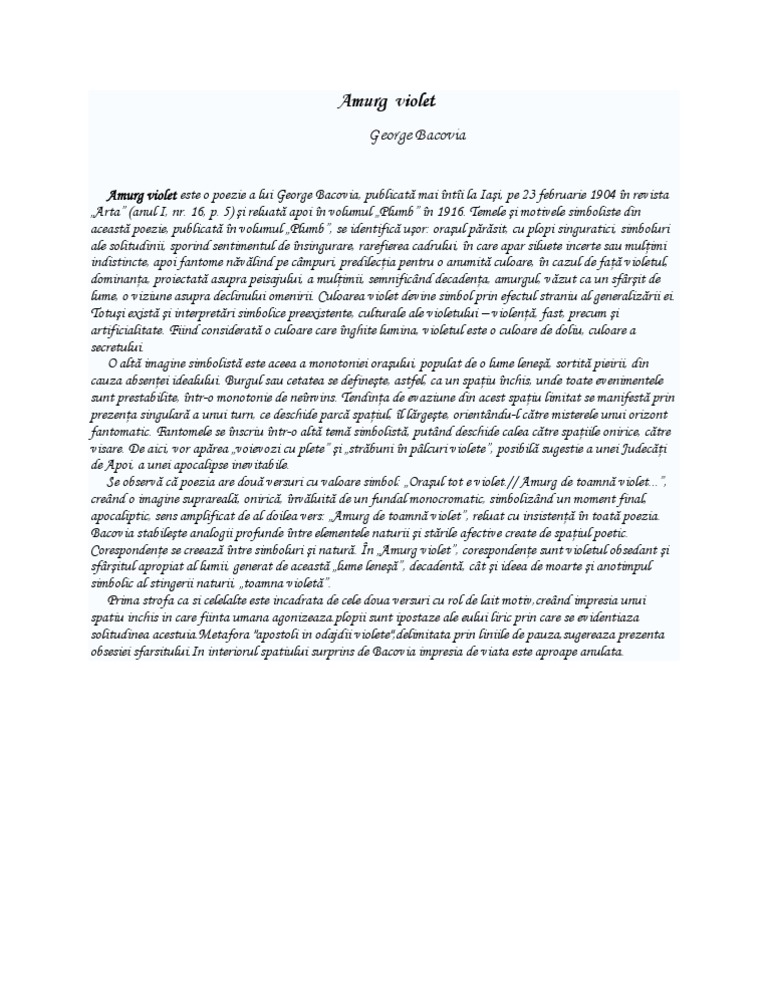 Amurg Violet De George Bacovia Comentariu Literar Si Versuri Pentru Bacalaureat