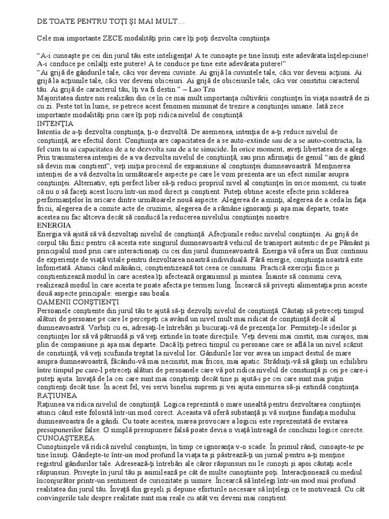 Constiinţa Este Potenţialul Intregii Creaţii De Toate Pentru Toţi Si Mai Mult