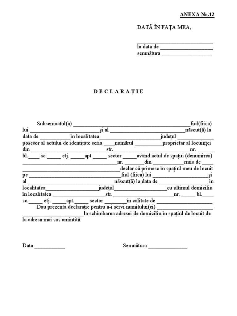 Anexa12 Declaratie De Luare In Spatiul Locativ A Proprietarului Pdf