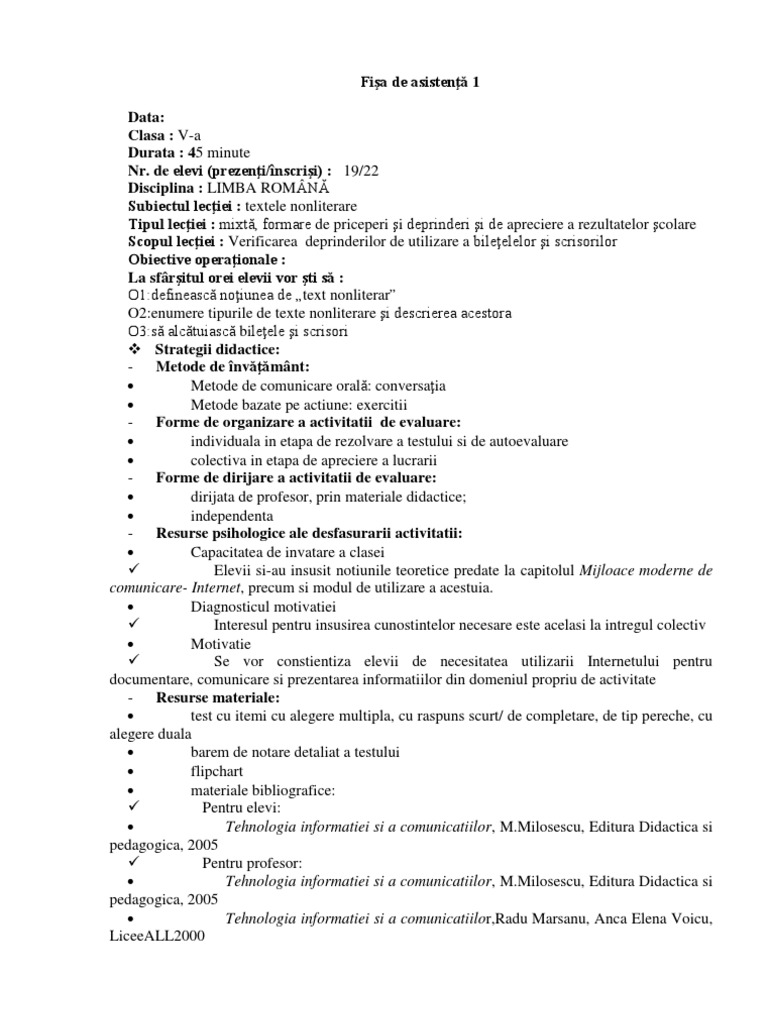 Doc Model Fisa De Asistenta La Oră Vica Bejan Academia Edu