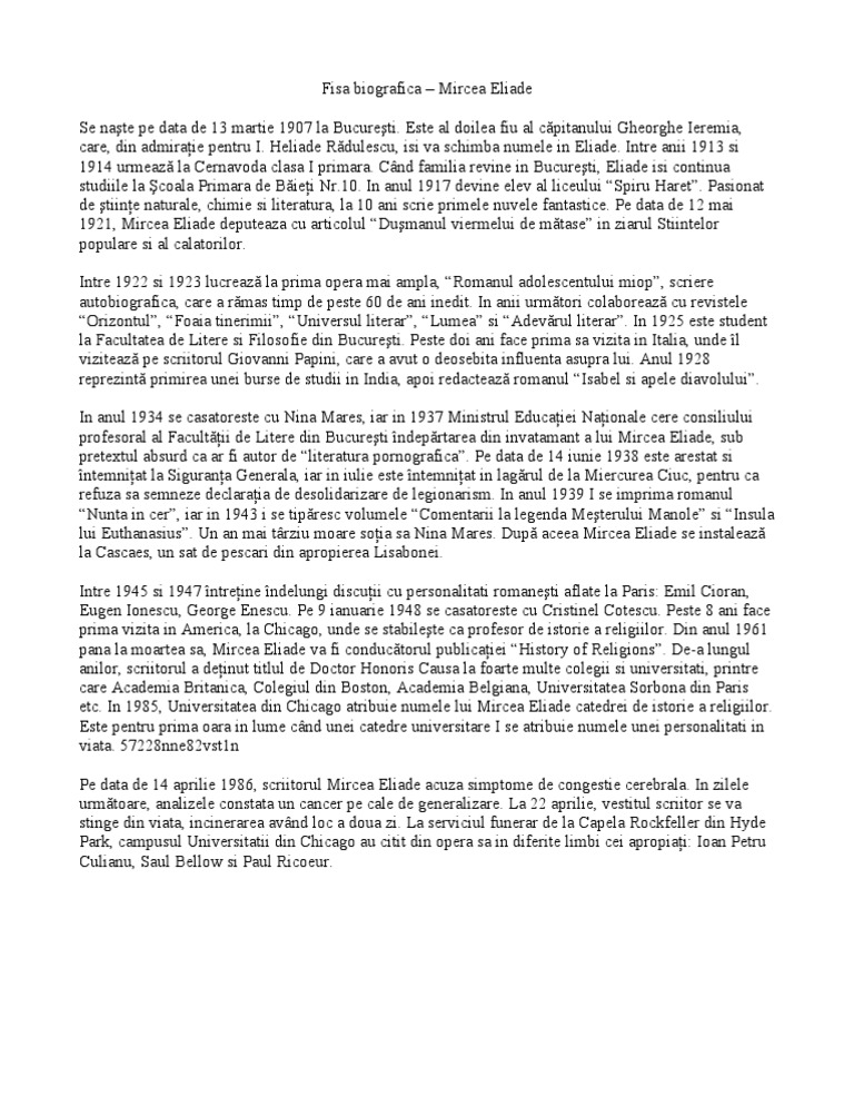 Fisa Biografica Mircea Eliade Docx Document
