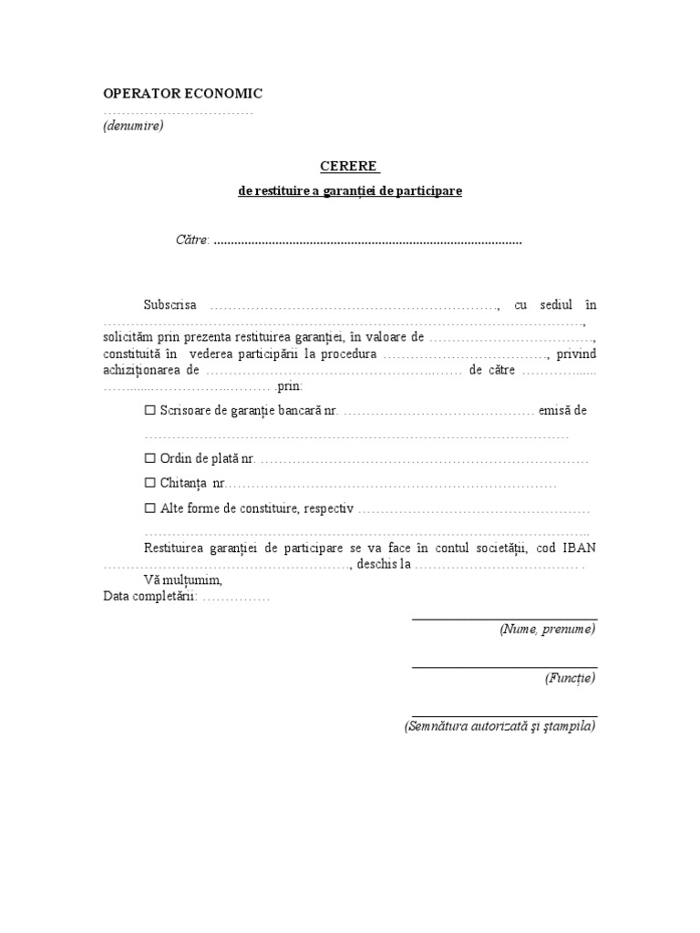 Model Cerere Restituire Garantie De Participare