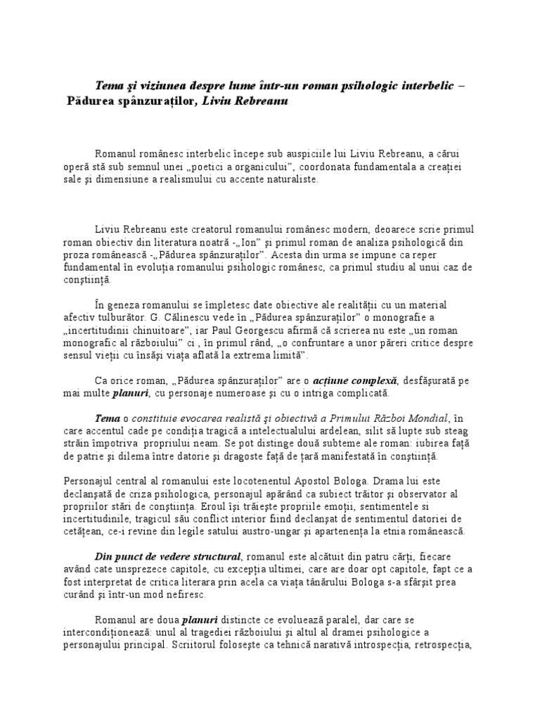Roman Psiholgic Interbelic Tema Si Viziunea Despre Lume Intr Un Roman Psihologic Interbelic Pădurea Spanzuraţilor Liviu Rebreanu