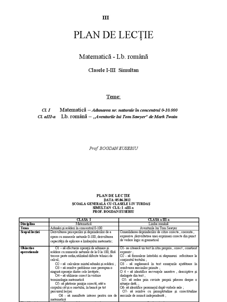 Doc Proiect Didactic La Clase Simultane Iii Iv Buharu Aura Academia Edu