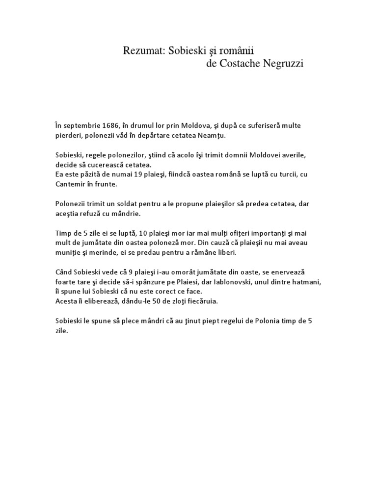 Alcătuiește Rezumatul Textului Sobieski și Romanii De Costache Negruzzi Brainly Ro